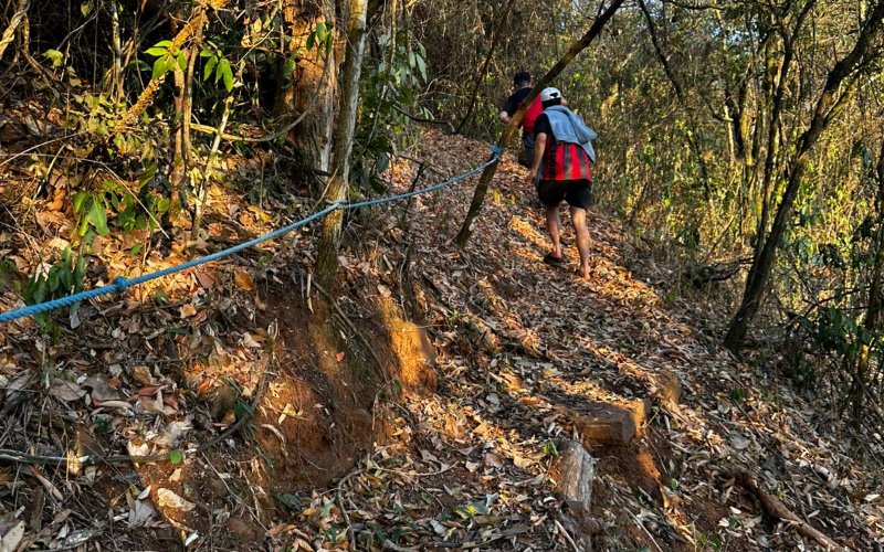 Trilha guiada ao Cruzeiro do Morro Pelado, com vistas da Serra do Itaqueri e contexto histórico ao longo do percurso.